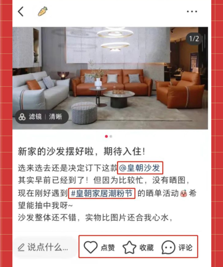 2、拍攝完畢,以視頻、圖片形式上傳至微信朋友圈、視頻號、抖音@RoyalAG8貴賓會沙發(fā)、小紅書@AG8貴賓會沙發(fā),并添加話題#AG8貴賓會潮粉節(jié),配上您對產(chǎn)品的使用感受,吸引更多用戶評論、點贊、轉(zhuǎn)發(fā)!