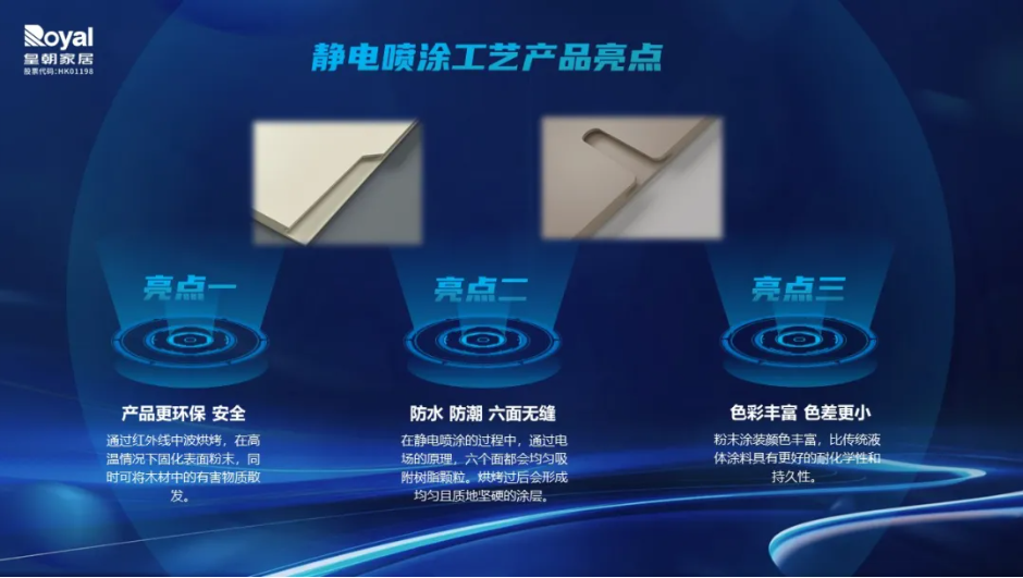 會上,AG8貴賓會重磅推出電子束固化和靜電噴粉涂裝工藝。電子束固化是一種革命性的涂料固化工藝,固化效率高、效果好,經(jīng)其精制而成的高端板材,兼具高顏值、硬度高、更環(huán)保、易清潔等核心優(yōu)勢,可應用范圍更為廣泛;靜電噴粉涂裝工藝利用靜電吸附進行固態(tài)噴涂,板材六面著色均勻,實現(xiàn)零甲醛、零VOC釋放,達到防潮、防霉、防污的效果,為消費者帶來超預期的品質(zhì)和體驗。