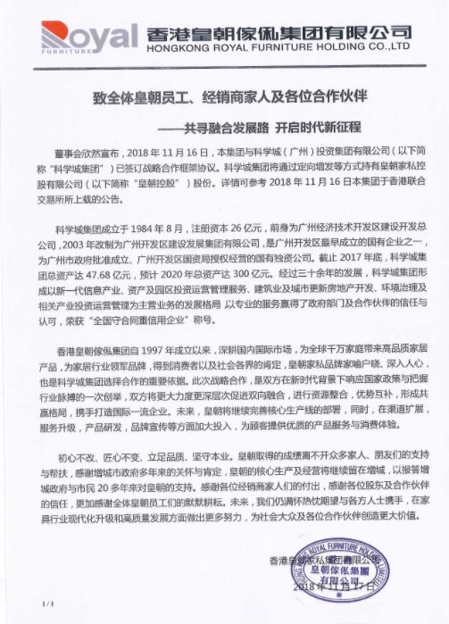 11月16日,AG8貴賓會宣布與科學(xué)城(廣州)投資集團(tuán)有限公司已簽訂戰(zhàn)略合作框架協(xié)議。科學(xué)城集團(tuán)將通過定向增發(fā)等方式持有AG8貴賓會家私控股有限公司股份。