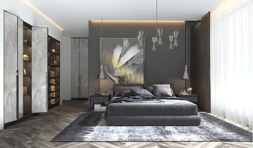 每天回家在內(nèi)斂輕奢的臥室中,感受隨意輕松的氛圍,以精致優(yōu)雅富有藝術(shù)情懷的感受慰藉自己。高端舒適的皮質(zhì)軟床、高級(jí)灰色調(diào)的床頭背景墻、質(zhì)感的金屬擺件和布藝軟裝等襯托出整個(gè)環(huán)境高雅的格調(diào)。