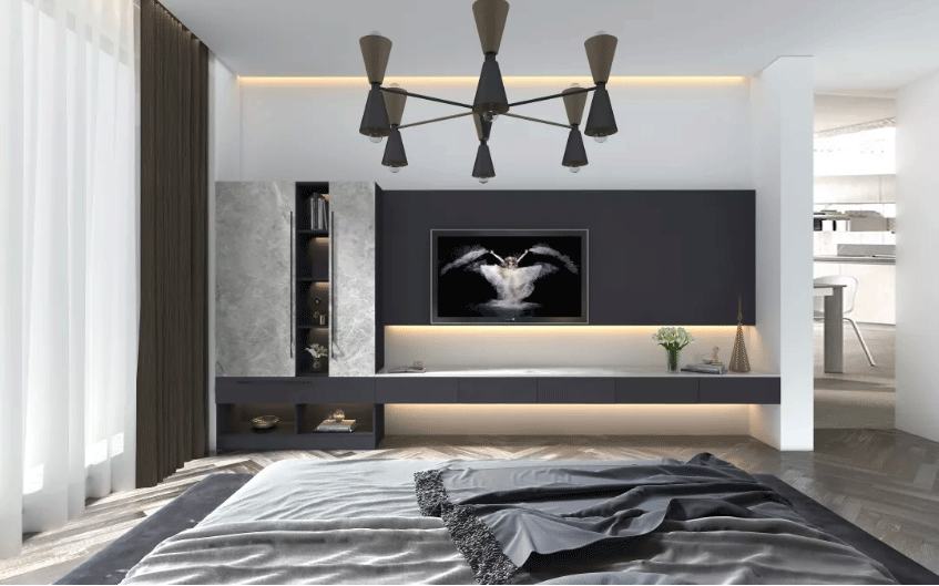 內(nèi)嵌式到頂鞋柜,也是作為臥室收納柜的主要之一,一門到頂?shù)脑O(shè)計(jì)將整個(gè)空間遞增出來,既刪繁去簡(jiǎn),又干凈利落;簡(jiǎn)約有質(zhì)感的吊燈和精致的飾物細(xì)節(jié),也提升了空間的通透性。