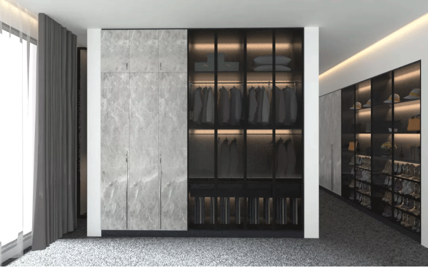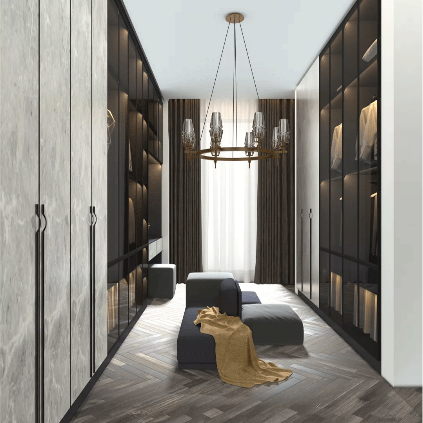 對(duì)開式的衣帽間裝滿了女王的戰(zhàn)袍,將生活質(zhì)感表現(xiàn)得淋漓盡致,兩面都是入墻到頂式衣柜,既充分的展現(xiàn)了衣帽間的儲(chǔ)存功能,又展現(xiàn)了其美觀整體性。