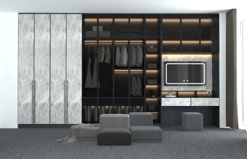 當(dāng)然,在這個(gè)“有顏任性”的時(shí)代,妝容也是“送分題”。窗戶邊結(jié)合衣柜做了一字型的妝臺(tái),折疊門、智能鏡、全透式玻璃抽、以及燈光的巧妙設(shè)計(jì)等足以撐起這場(chǎng)華服盛宴。