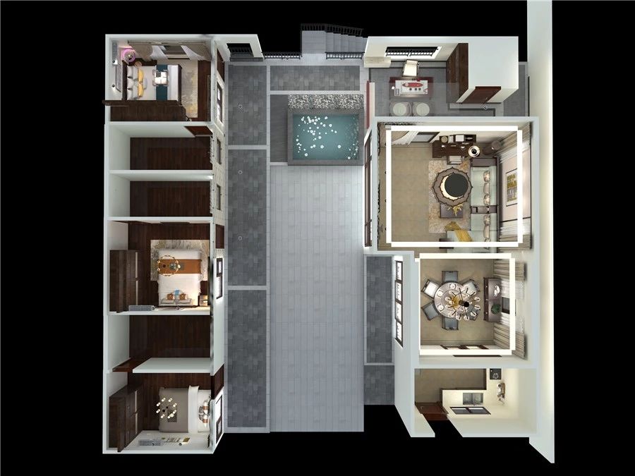 案例中,客廳與餐廳的設(shè)計(jì)也采用了客餐廳一體化的設(shè)計(jì),客廳與餐廳兩個(gè)功能區(qū)之間無隔斷,視覺上凸顯了現(xiàn)代家居的層次感,注重整體的開闊和通透,突破阻礙,使空間更為寬敞。