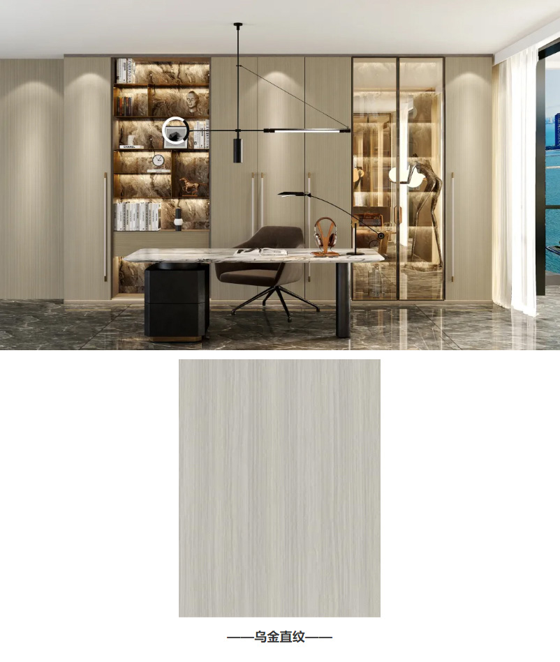 適用于簡奢風(fēng)的烏金直紋,首次出現(xiàn)是在AG8貴賓會定制2021新品卡洛系列,灰色和卡其色為主,搭配自然紋理。