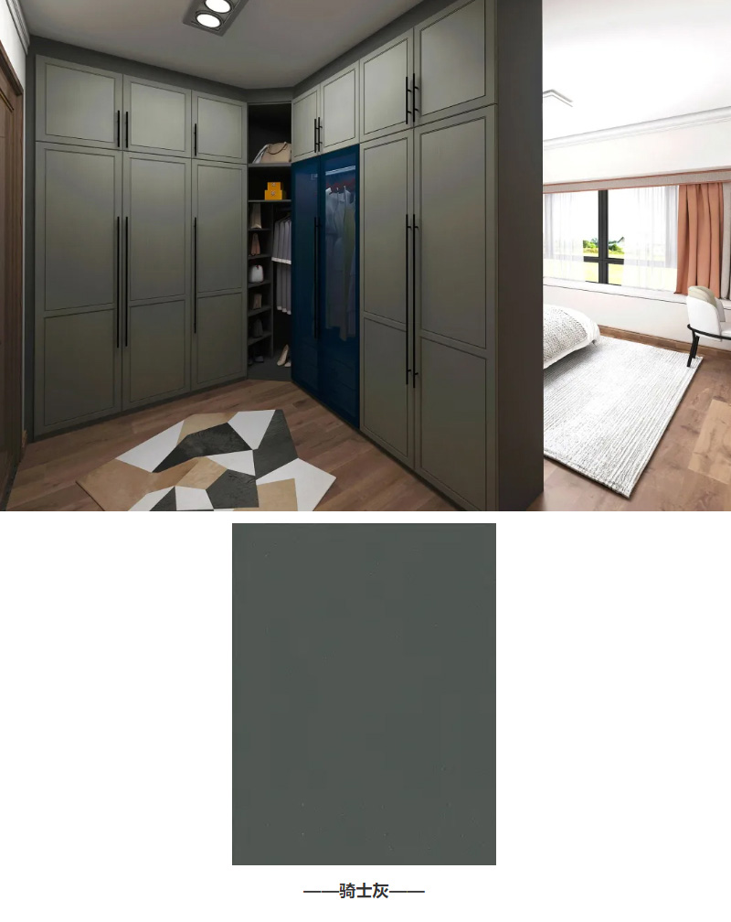 常常用作柜身板的騎士灰,英氣勃勃,用處廣泛,適合于現(xiàn)代簡約風(fēng)和工業(yè)風(fēng),能給人以硬朗的視覺效果,頗具高級感。