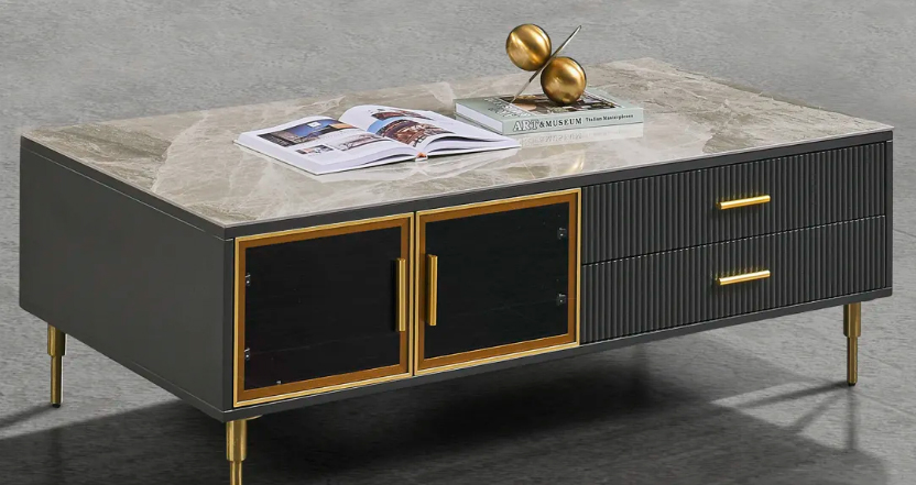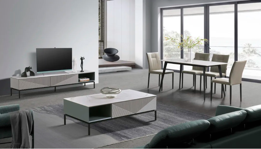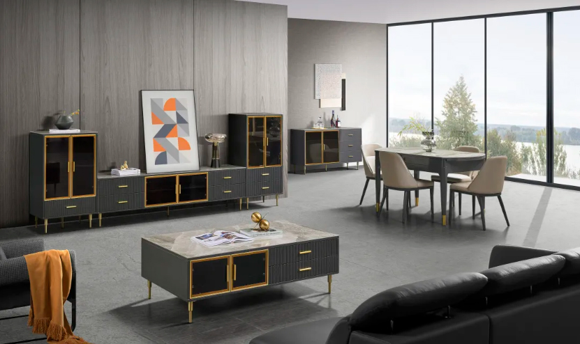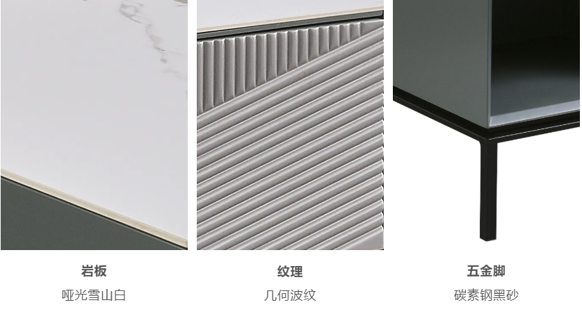 以茶幾為例,臺(tái)面采用意大利淺灰亮光巖板,色澤雅致清新,紋理飄逸靈動(dòng),營造出極具藝術(shù)氣息的格調(diào)空間。此外,金色邊框玻璃門搭配黑色烤漆柜體,通過簡(jiǎn)單的線條勾勒,走出千篇一律,在簡(jiǎn)與奢之間尋得平衡。