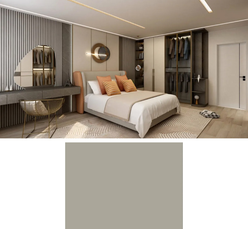 灰綠色能給人一種舒緩的氛圍感,是接近自然的色彩,使空間色調(diào)更加舒適養(yǎng)眼。