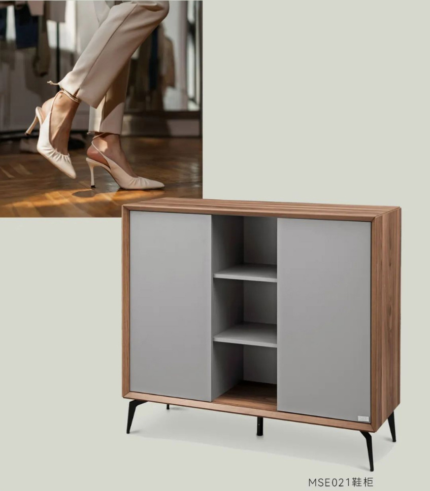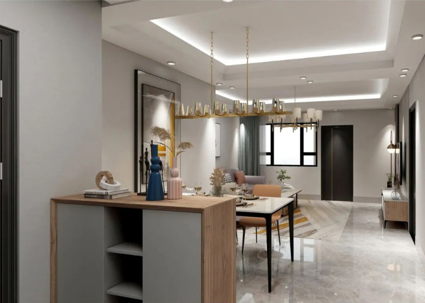 入戶空間設計精致簡約,進門處的鞋柜起到隔斷空間的作用,又可以收納雨傘、快遞等雜物,玄關區(qū)想亂都難。