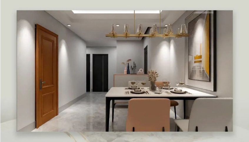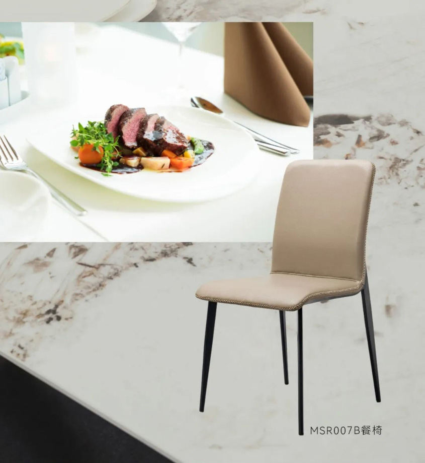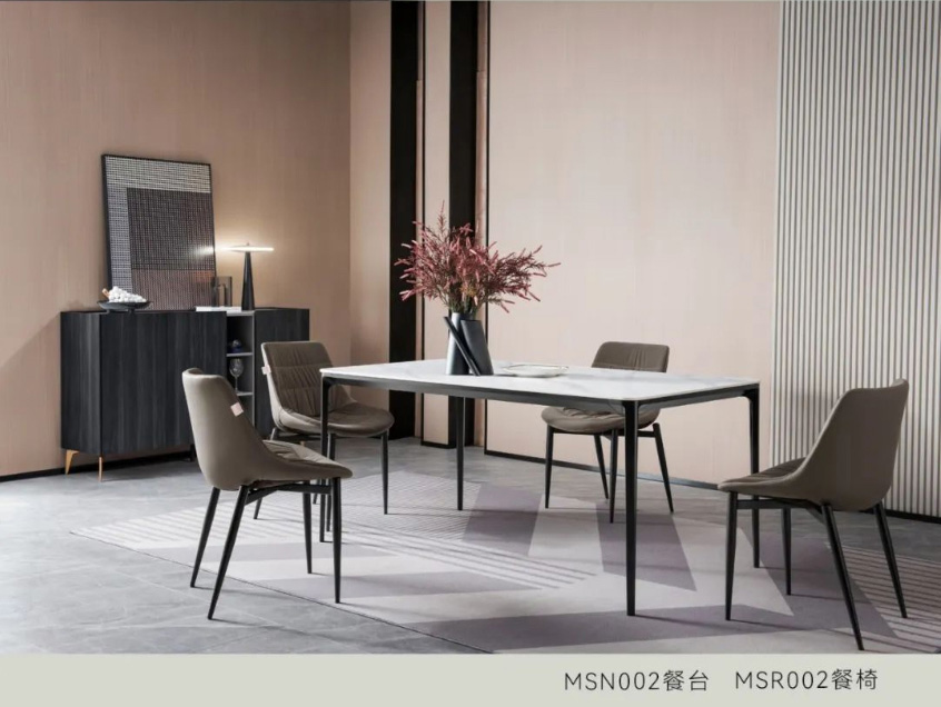 巖板餐桌更顯品質,而座椅的冷暖色調點綴了空間。