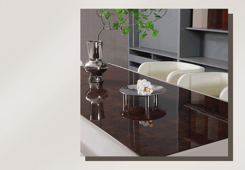 名貴樹(shù)瘤的加入,高級(jí)感呼之欲出。亮光鋼琴烤漆臺(tái)面讓空間形態(tài)變得通透,在燈光的映射下,幻化出令人眩暈的光彩,衍生當(dāng)代輕奢風(fēng)韻。
