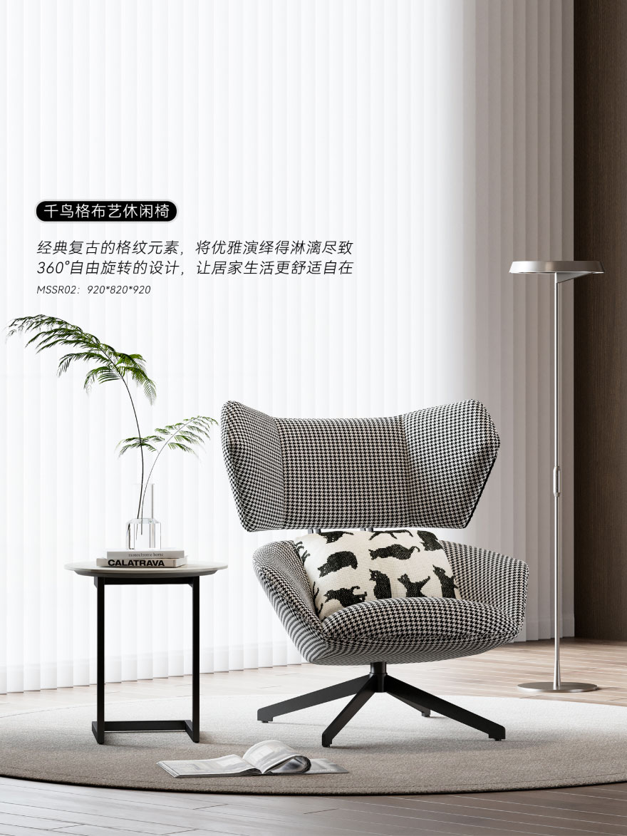 ① 千鳥格布藝休閑椅:經(jīng)典復(fù)古的格紋元素,將優(yōu)雅演繹得淋漓盡致;360°自由旋轉(zhuǎn)的設(shè)計(jì),讓居家生活更舒適自在。