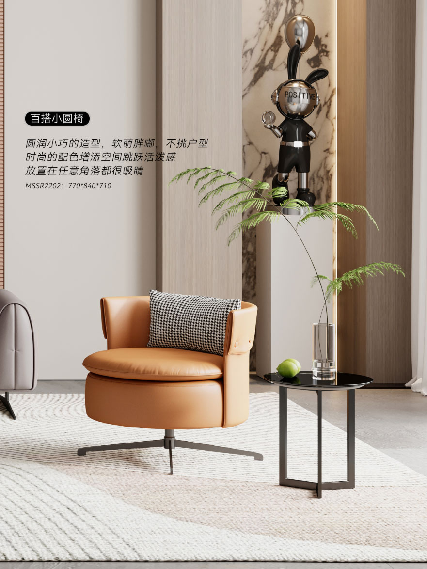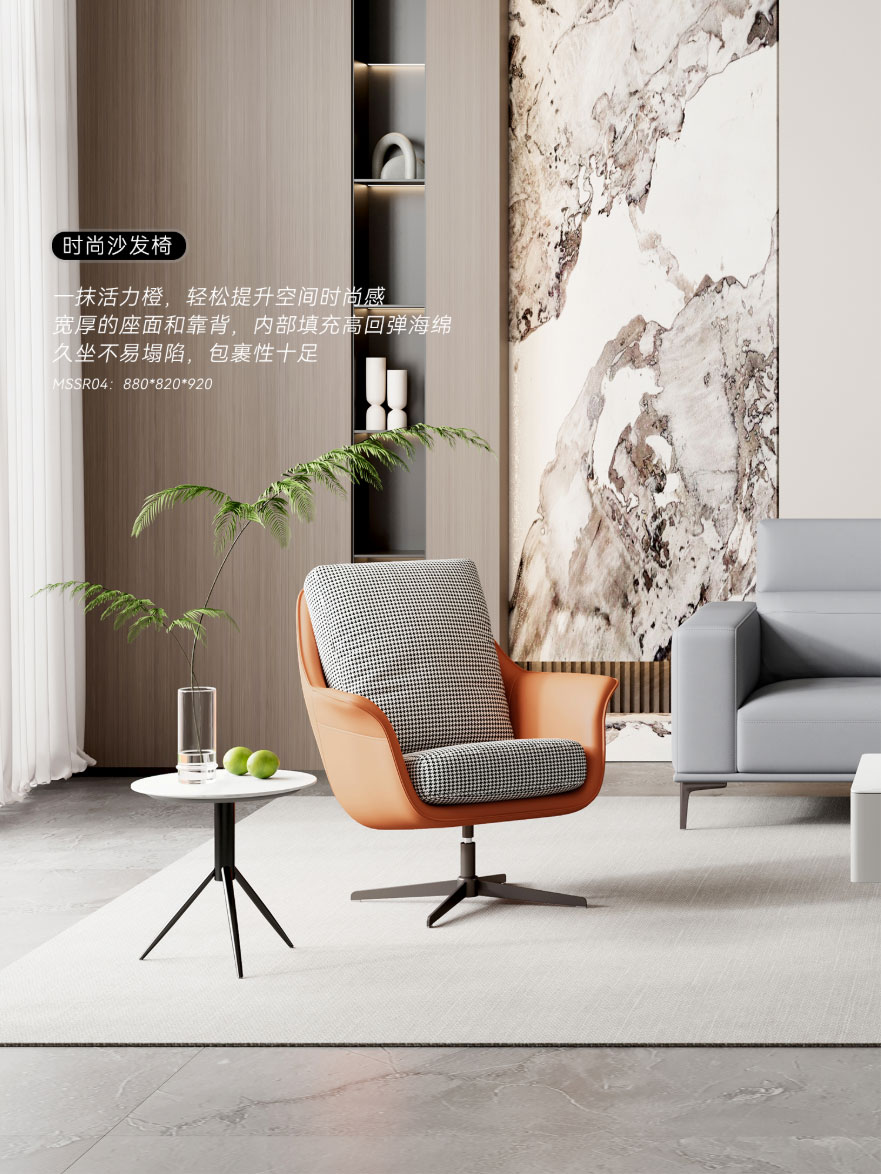 ② 時(shí)尚沙發(fā)椅:一抹活力橙,輕松提升空間時(shí)尚感;寬厚的座面和靠背,內(nèi)部填充高回彈海綿,久坐不易塌陷,包裹性十足。