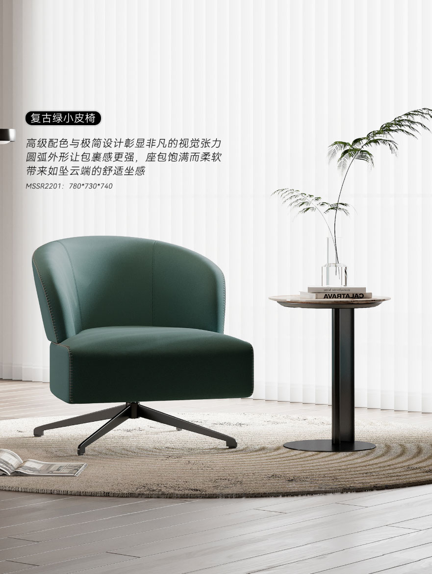 ③ 復(fù)古綠小皮椅:高級(jí)配色與極簡設(shè)計(jì)彰顯非凡的視覺張力;圓弧外形讓包裹感更強(qiáng),座包飽滿而柔軟,帶來如墜云端的舒適坐感。