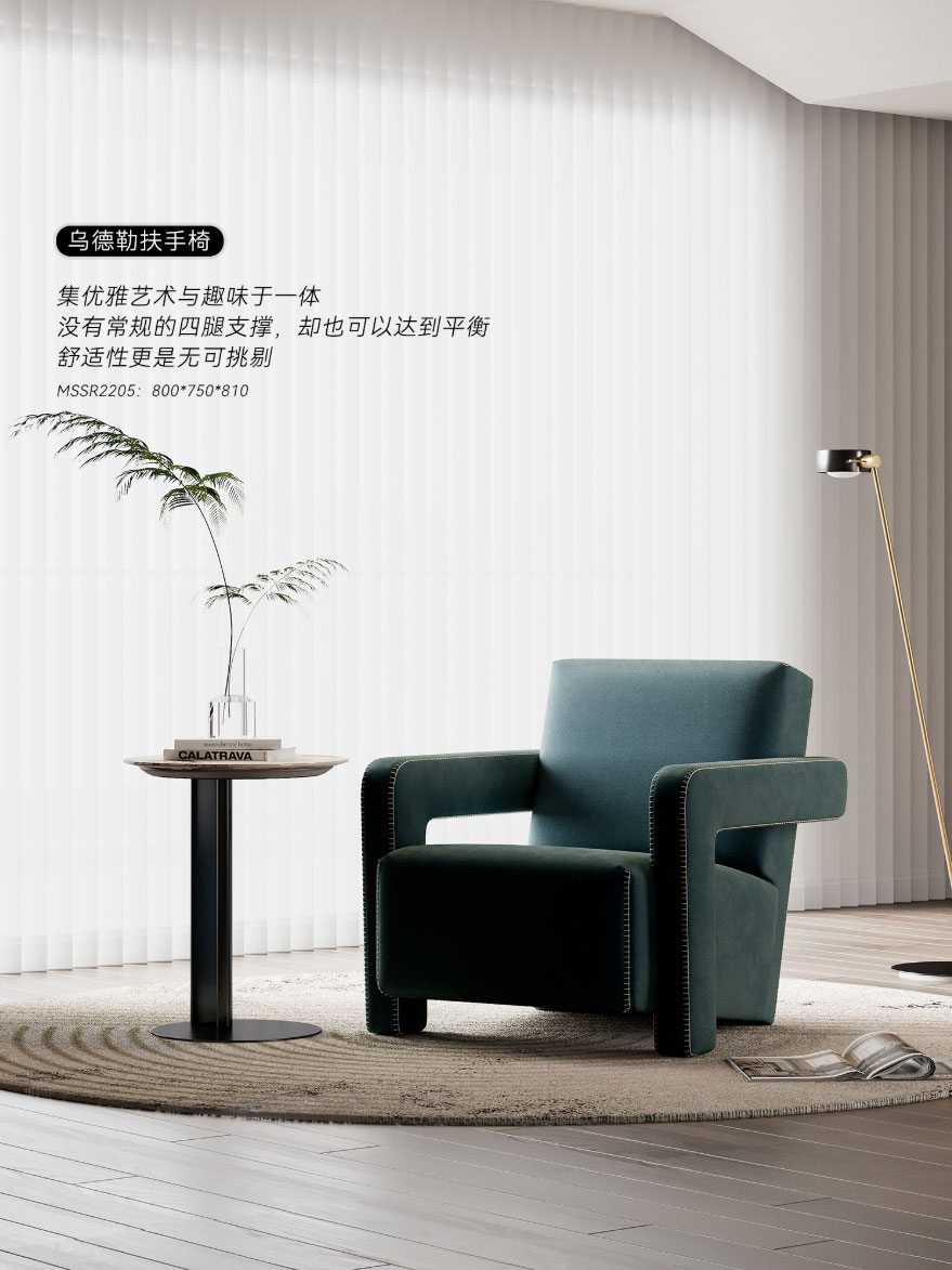 ⑥ 烏德勒扶手椅:集優(yōu)雅藝術(shù)與趣味于一體,沒有常規(guī)的四腿支撐,卻也可以達(dá)到平衡,舒適性更是無可挑剔。