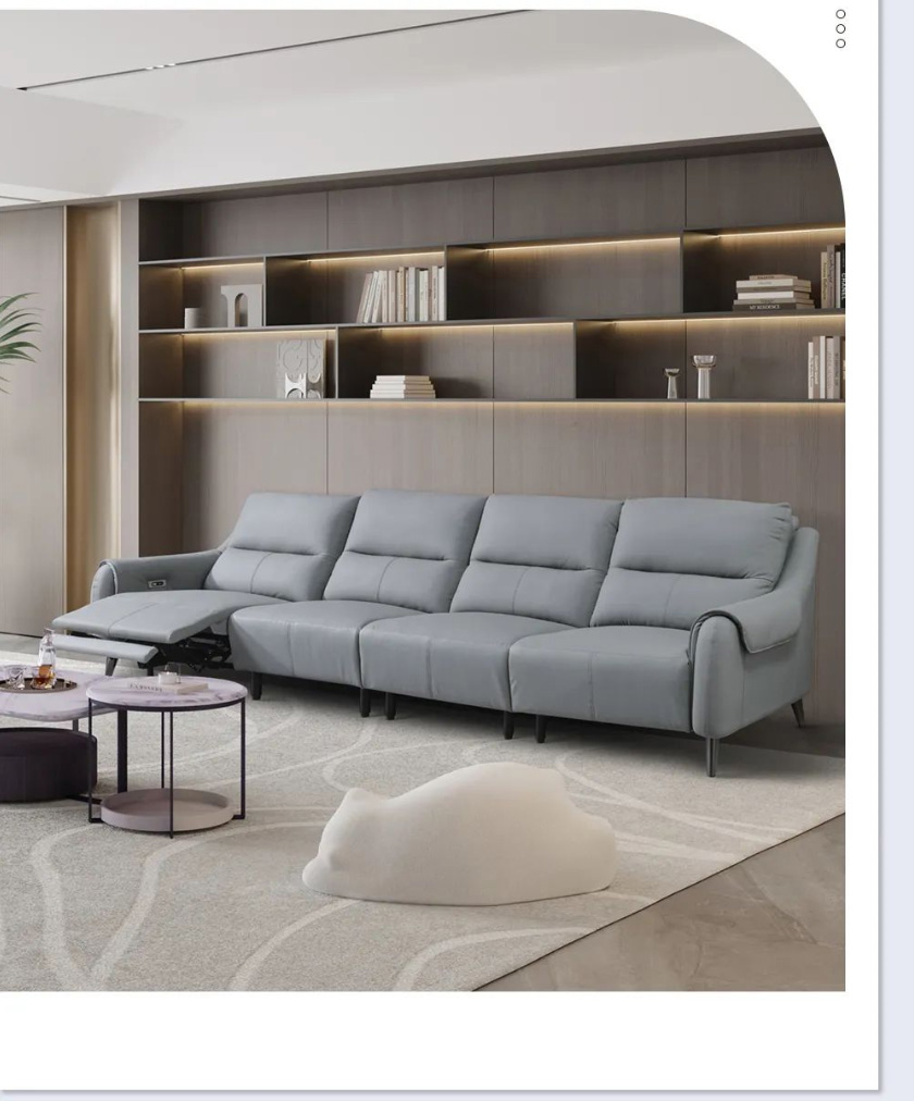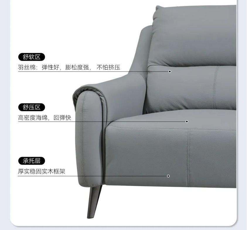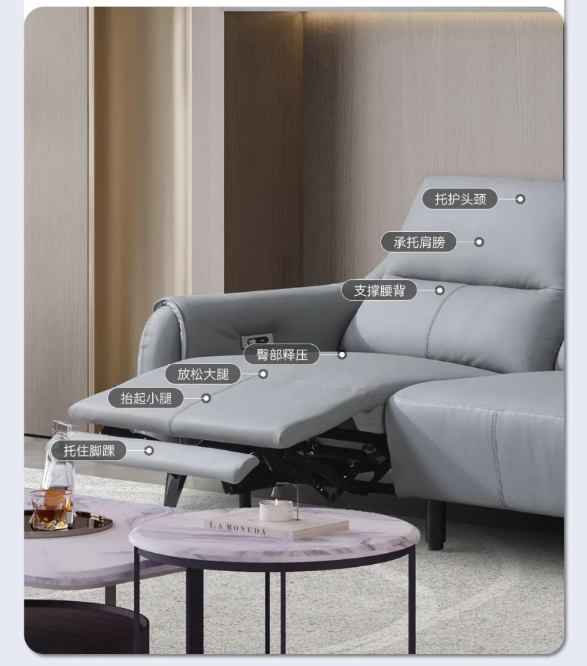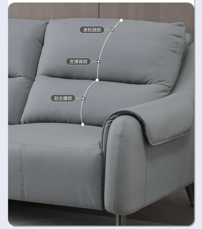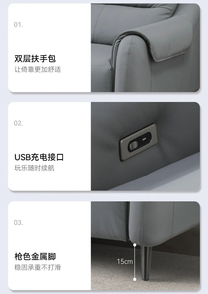 以遨游宇宙的太空艙為設(shè)計(jì)靈感,沙發(fā)整體輪廓柔和,低飽和度的灰色沉穩(wěn)耐看。沙發(fā)面料采用進(jìn)口頭層牛皮,肌理自然清晰,膚感柔軟舒適;電動(dòng)貴妃位可實(shí)現(xiàn)110~160°自主調(diào)節(jié),即按即停,一鍵深度放松,解鎖花式坐靠躺;沙發(fā)靠背上下分段,充分貼合肩頸腰背,柔軟舒壓;靠包飽滿填充高密度海綿,用料實(shí)在,給你軟而不塌、彈性十足的坐感;雙層扶手設(shè)計(jì),手臂搭靠的時(shí)候更加自然舒適;便捷USB充電口的加持,不用擔(dān)心玩樂斷電;還配有高挑金屬腳,穩(wěn)固承重,清潔也更省心。