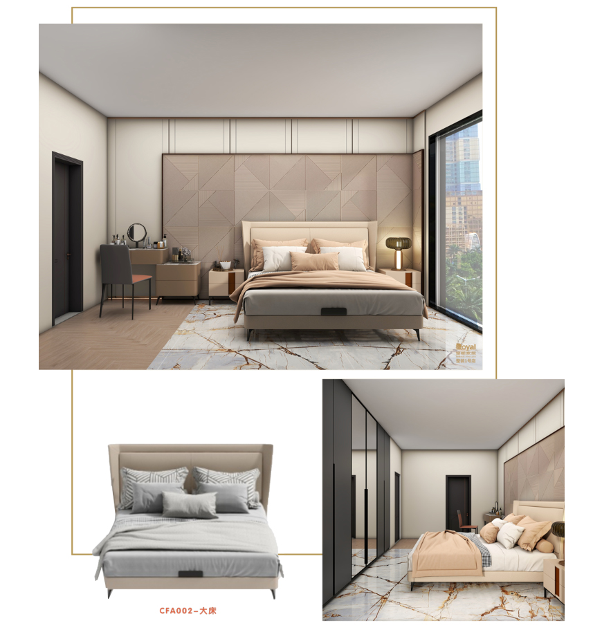 臥室,一個令人心醉、放松的舒適空間。柔和的燈光氛圍讓感受到一份寧靜,讓你自由的呼吸完全放松。從木紋地板到光滑的大理石地板,藝術(shù)自然幾何條線設(shè)計的背景墻,每一寸的細節(jié)都散發(fā)出高品質(zhì)的奢華感。暖色調(diào)的臥室家具配套,增加空間的舒適感。柔軟的枕頭被子讓你可以沉浸在夢幻般的世界中,讓每一個夜晚都成為一次愉悅的旅程。